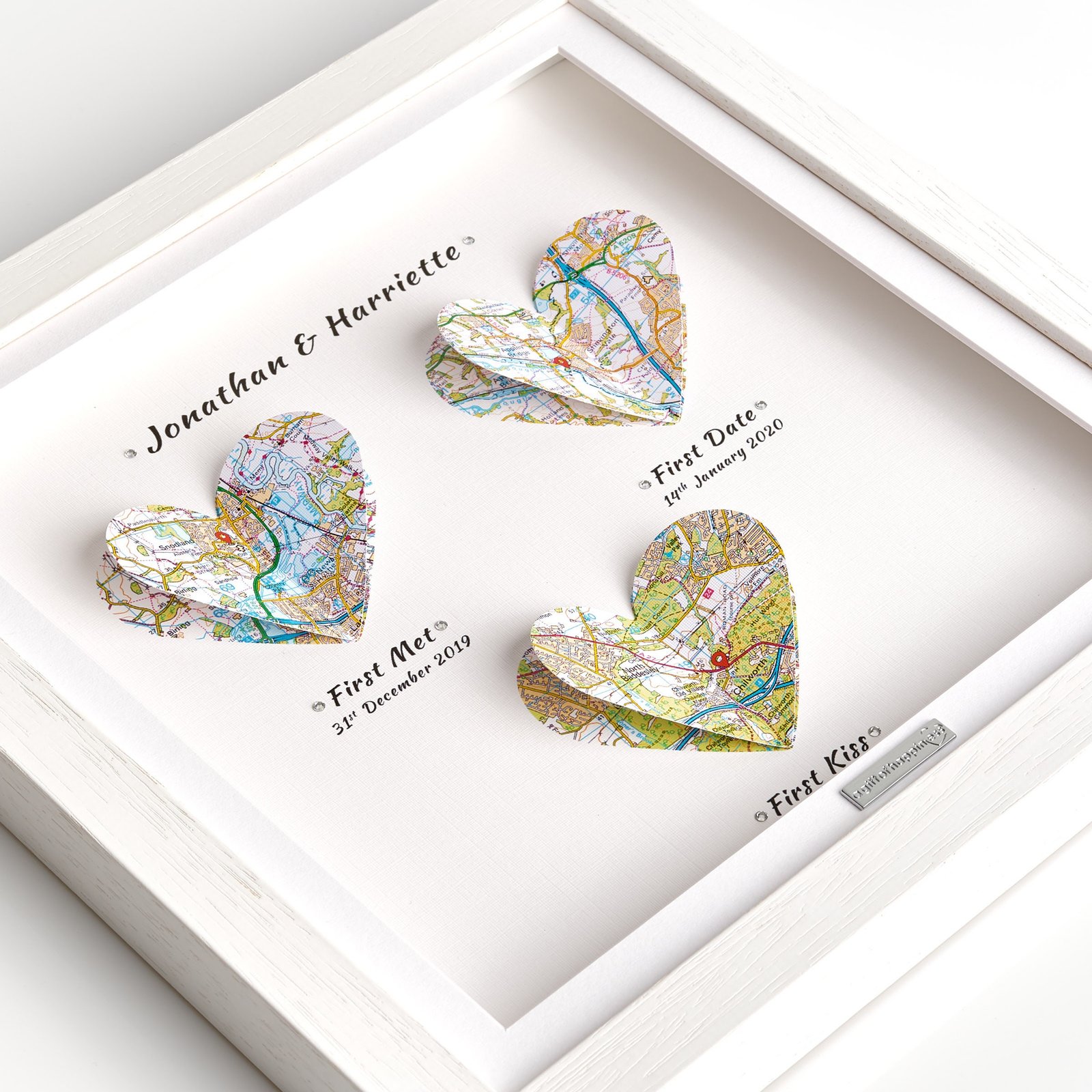 Celebrate your journey of love with our Heart Maps Anniversary Gift, a thoughtful and sentimental way to honor the special moments in your relationship. This unique gift features three heart-shaped maps, each highlighting a significant location in your love story – from where you first met, to your memorable first date, and the magical spot of your first kiss. Whether you’re looking for a meaningful anniversary gift for him or her, this personalized keepsake will remind you both of the milestones that have shaped your bond and create a lasting memory of your love story.